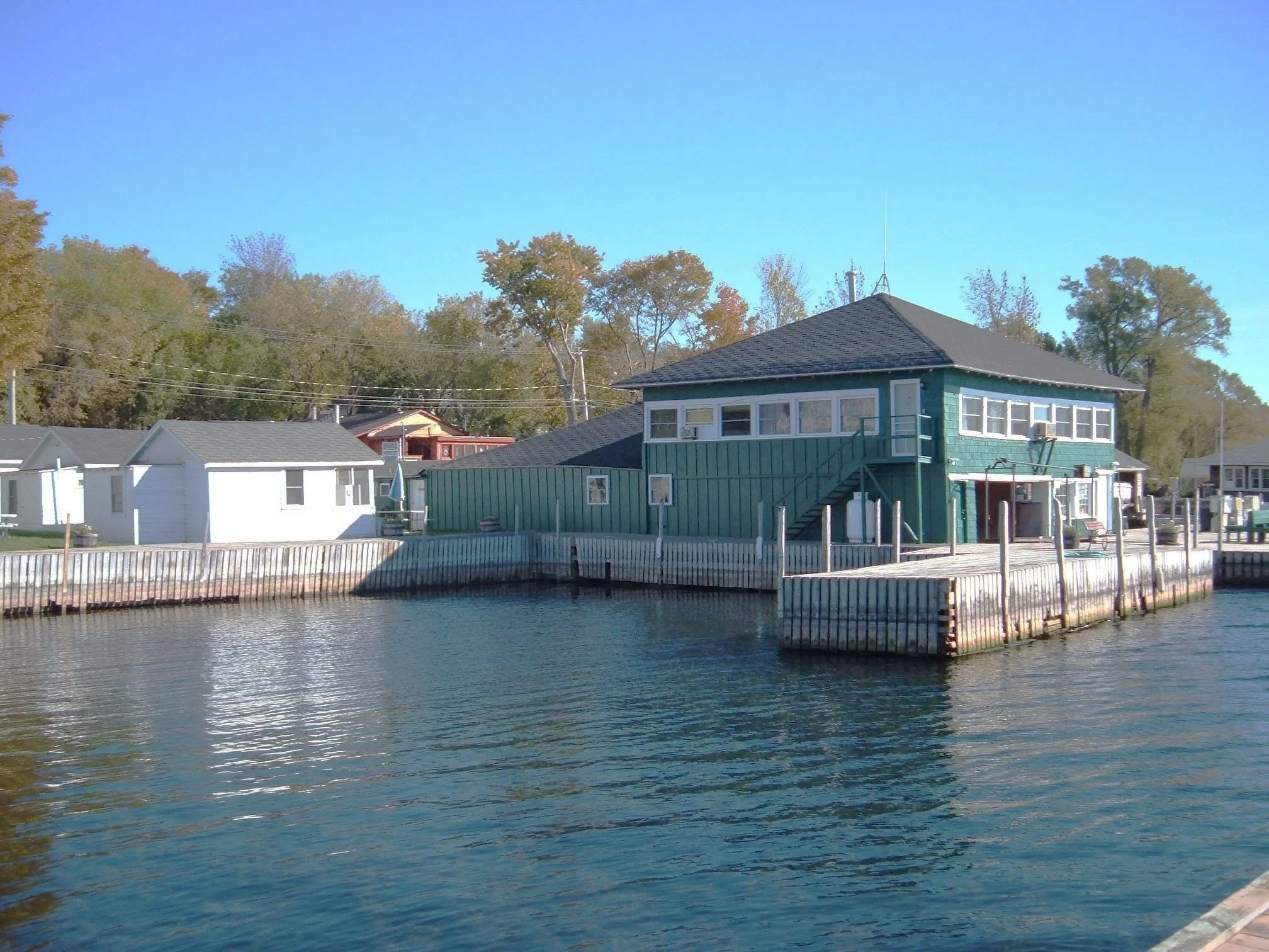 A teal and gray boathouse on a waterway, with neighboring white boathouses, trees, and a clear blue sky in the background.